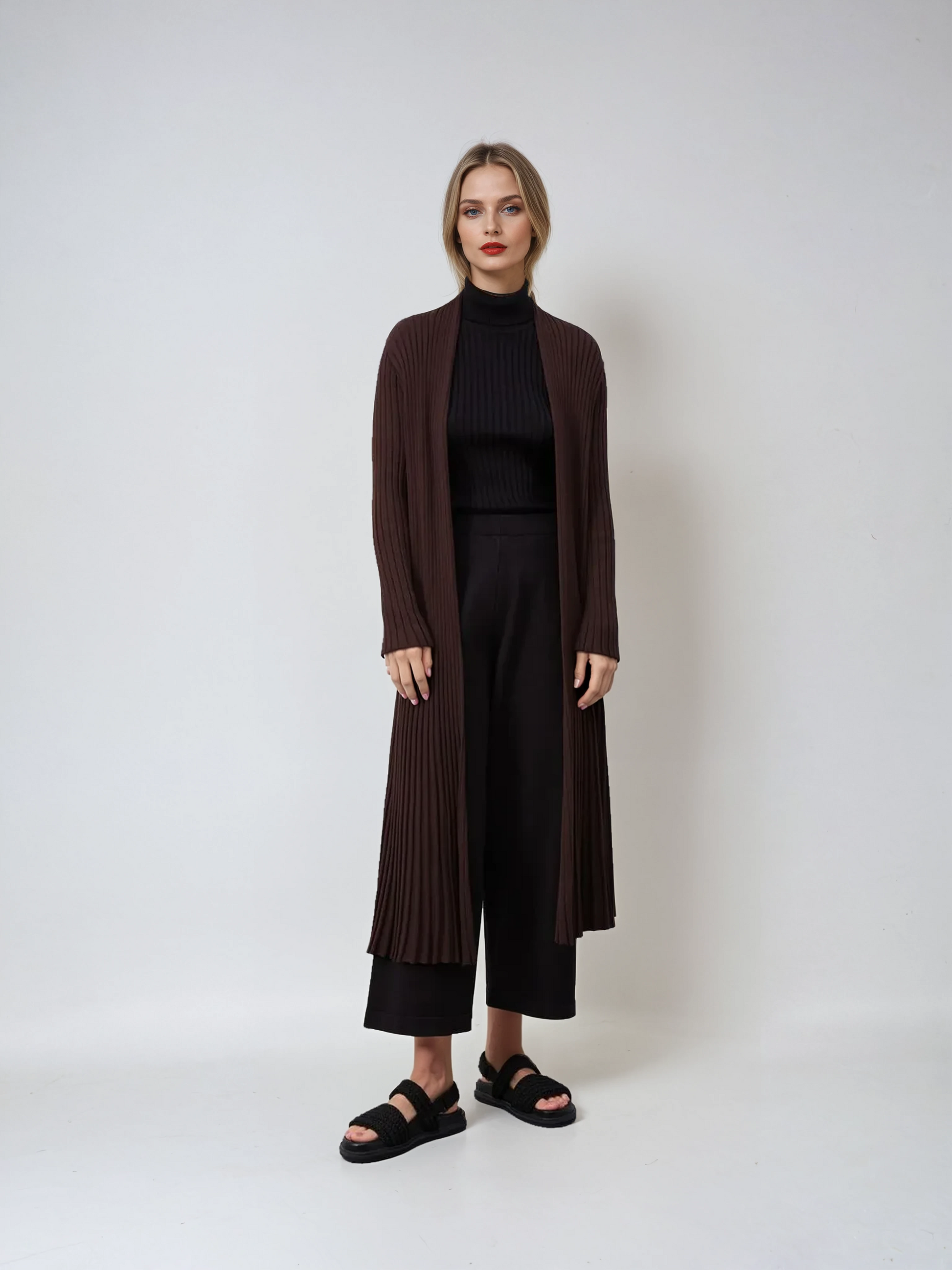 Elegant and versatile, this long ribbed knit cardigan in dark brown adds sophistication to any outfit. Designed with a straight, fluid silhouette and an open front, it enhances natural movement while offering comfort and style in equal measure.